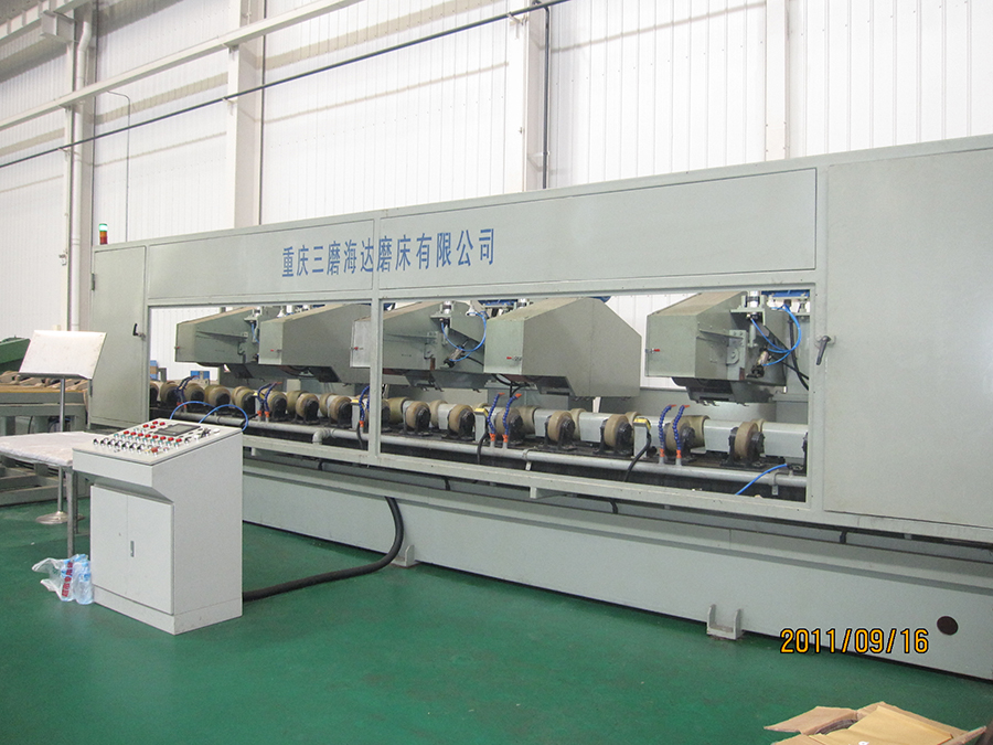 1.采用下壓式砂帶磨削,為提高效率,配備了多個(gè)磨頭,可對(duì)液壓缸實(shí)現(xiàn)粗磨、半精磨、精磨、拋光等多道工藝,以砂帶作磨具實(shí)現(xiàn)中長(zhǎng)工件外圓磨削拋光。